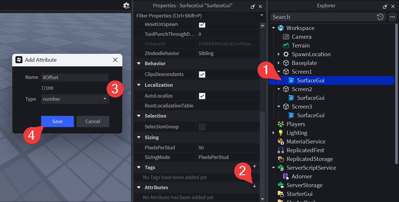 For examples, we will be using the screens from this game: https://www.roblox.com/games/19002148628. You can edit this game in Studio by pressing the ... button above the play button and pressing Edit in Studio. It contains three screens in Workspace: Screen1, Screen2 and Screen3. It also has the adorner module added to ServerScriptService already.