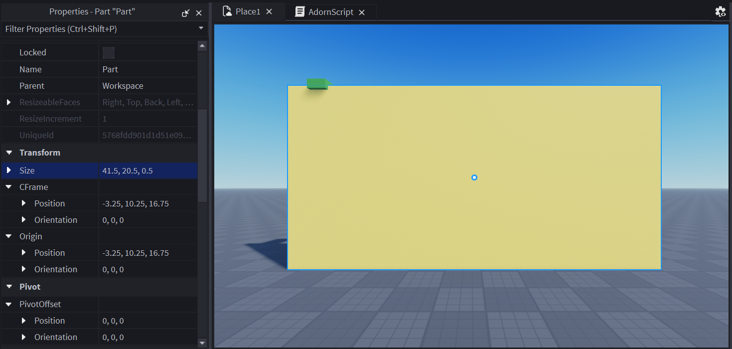 One more thing we need to calculate before finishing the script is the total size of our 2D canvas. It's not infinite after all. In our example the screens are all lined up nicely, so we can just temporarily create a new part that's the size of all screens combined and check its size. The part is 41.5 studs wide and 20.5 studs tall, so the total size of our canvas in pixels is 50 times bigger, which is 2075 (41.5 × 50) by 1025 (20.5 × 50) pixels.