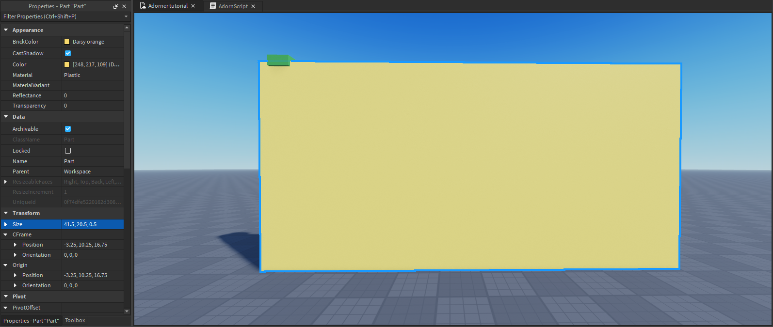 One more thing we need to calculate before finishing the script is the total size of our 2D canvas. It's not infinite after all. In our example the screens are all lined up nicely, so we can just temporarily create a new part that's the size of all screens combined and check its size. The part is 41.5 studs wide and 20.5 studs tall, so the total size of our canvas in pixels is 50 times bigger, which is 2075 (41.5 × 50) by 1025 (20.5 × 50) pixels.