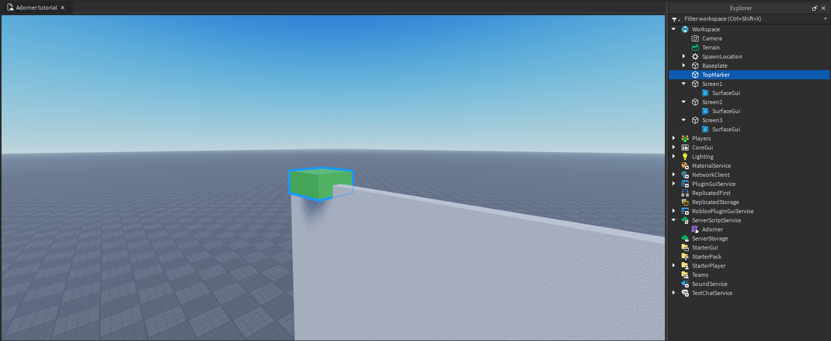 Continuing the example from the previous page, let's add a top marker part to our screens. Create a new part and place it on top of the highest screen, then move it so its center is touching the top of that screen. Name this part TopMarker. Make sure to also anchor it. In the future you should make it transparent and non-collidable, but that's not the point of this tutorial.