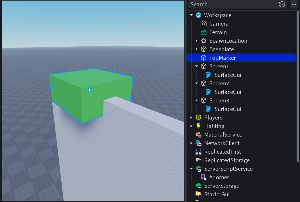 Continuing the example from the previous page, let's add a top marker part to our screens. Create a new part and place it on top of the highest screen, then move it so its center is touching the top of that screen. Name this part TopMarker. Make sure to also anchor it. In the future you should make it transparent and non-collidable, but that's not the point of this tutorial.