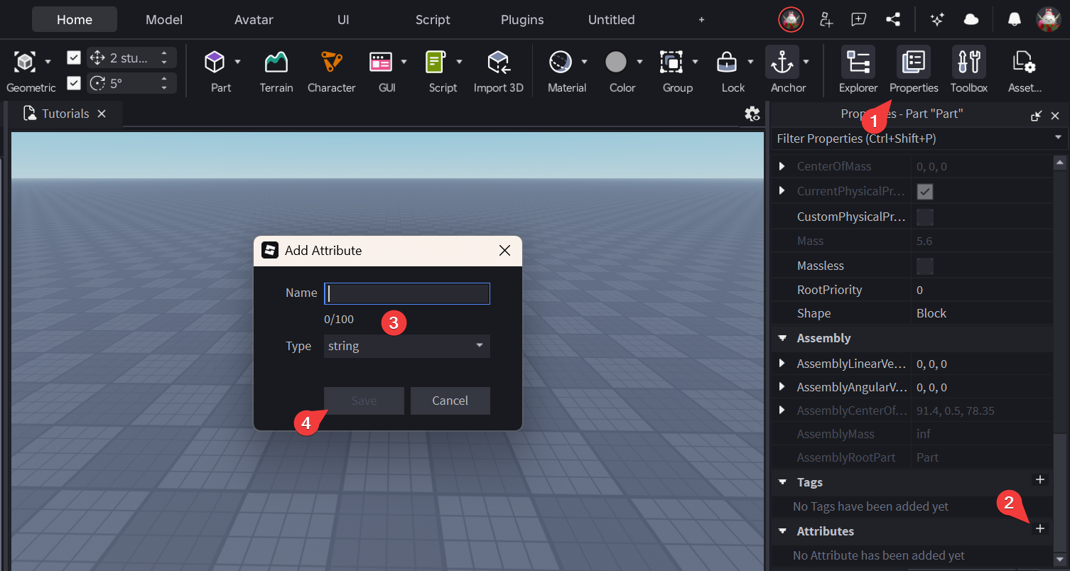 You can add attributes to instances by opening the Properties window, selecting the thing you want to add an attribute to, and scrolling to the very bottom of the Properties window. Press the + button next to Attributes and insert the name and type required by that attribute (both of those are always provided)