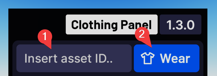 Most kinds of items can be equipped using the ID box at the top of the panel. Simply paste an ID into the box, press Wear and the panel will automatically figure out how that item should be equipped. The input box on the top of the panel supports: