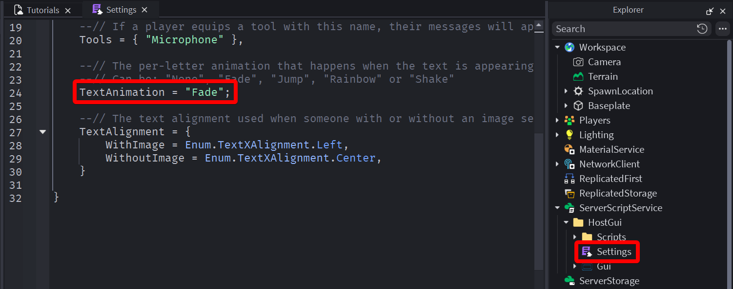 Open the Settings script by opening the HostGui folder and double clicking the Settings script. Locate the TextAnimation setting, which should be at or around line 24.