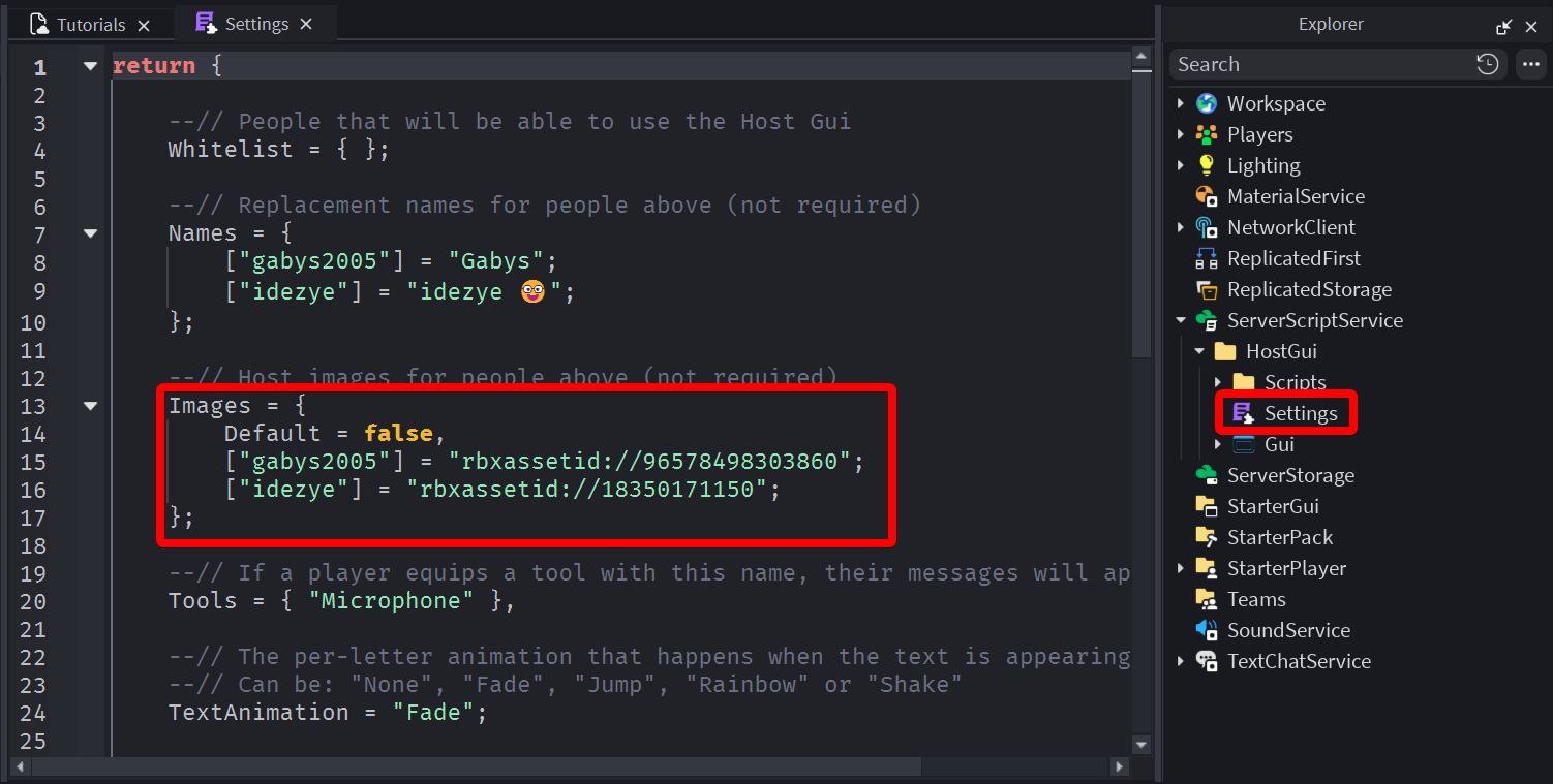Open the HostGui folder and double click the Settings script. The Images setting should be at or around line 13.