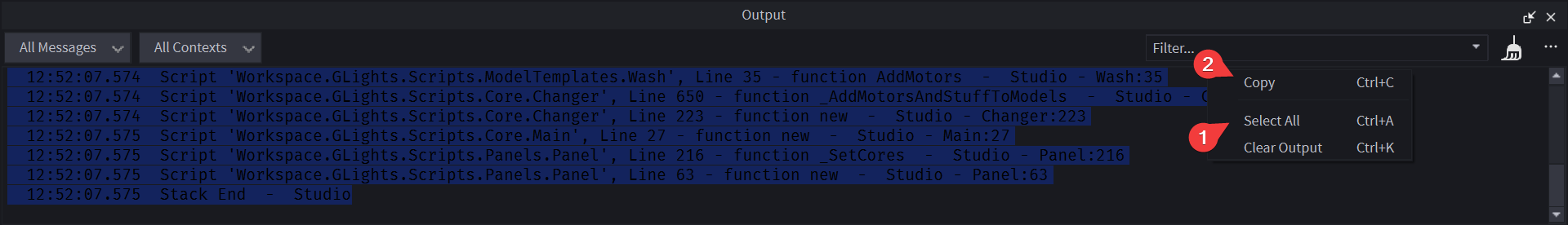 The output is a window in Roblox Studio that contains all errors and warnings that occured since the game started. It's very useful for finding errors. When asking for support, you might be asked to send the full output. Here how to do that: