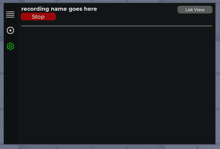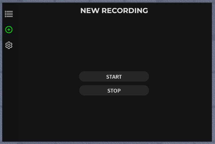 The new recording section contains two buttons: Start and Stop. Pressing the Start button will instantly start creating a recording and start measuring time. Pressing the stop button will prompt you to insert a name for it. This name is important, you'll need it when inserting the recording